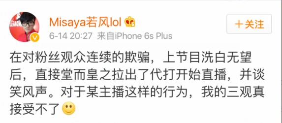 为此,若风发微博表示:在对粉丝观众连续的欺骗,上节目洗白无望后,直接堂而皇之拉出了代打开始直播,并谈笑风声。对于某主播这样的行为,我的三观真接受不了。