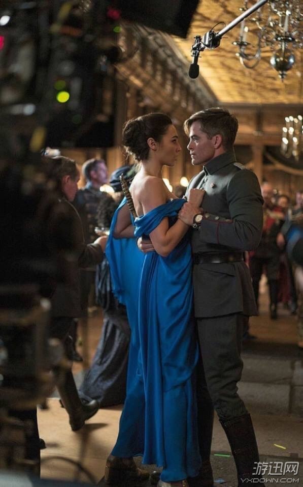 在这组剧照中,戴安娜和史蒂夫几次相拥,看起来非常甜蜜,舞会那场戏身穿蓝色礼服的女神背上是火神之剑,二人像是在跳舞,但从史蒂夫的表情来看,又非常紧张,或许是在帮戴安娜藏起背上的剑。