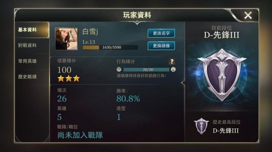 她的游戏ID叫“白雪j”,目前段位是先锋3(等同于钻石3)。不过从她目前晒出的战绩图来看,水平应该是越来越好,她还曾发文表示:“想成立小梅花女子战队!”
