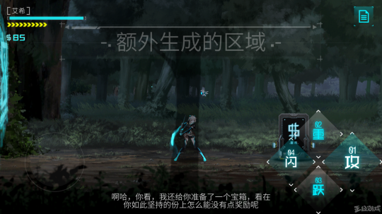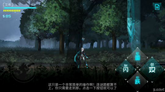 游戏一开始就是只要是个动作游戏就会有的中规中矩的新手教程,轻击、重击、跳跃、闪避,再加上后面学会的流,就是所有的打击方式。借助硬直和破绽进行防反,动作一气呵成,动作游戏的快感十足,另外在防反之后的炫光效果显得十分酷炫,给人以爽快的感觉。移动端加入了虚拟按键以及虚拟摇杆,但打击感没有因此弱于主机以及PC版本,在操作上十分流畅。
