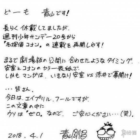 青山刚昌在4月1日愚人节发布了《柯南》漫画复刊的亲笔信