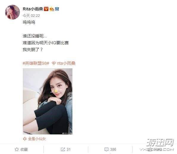 今天,LOL S8半决赛即将在下午开战,作为LPL解说的Rita,居然因为担心IG的比赛在深夜难以入睡!凌晨2点多,她微博晒出自拍,不过网友都被她的“腿毛”吸引了!