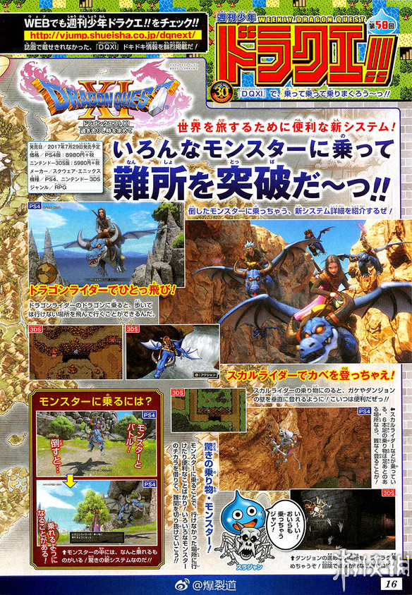 日本《Jump》杂志公布国民RPG新作《勇者斗恶龙11》新截图与情报,详细介绍了本作“骑乘怪兽”系统与游戏画面。