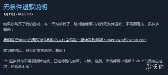 BLUE SKY是一名国内独立游戏开发者,在Steam上目前共有三款他制作的游戏,游戏一般都和“R18”“黄油”挂钩,这些打着擦边球的游戏售价都不高,都是11元,游戏本身质量到底怎样暂且不提,但是他有一项“无条件退款方案”颇受玩家们称道。