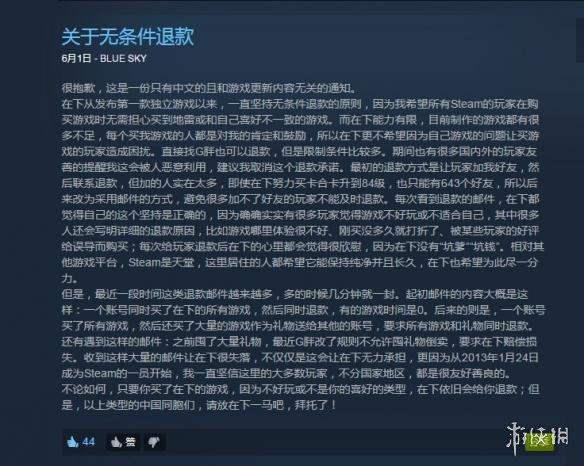 在儿童节这天,BLUE SKY在社区通告中发表了一份“只有中文的且和游戏更新内容无关的通知”,在通知中表示,最近他收到了大量的退款游邮件,多的时候几分钟就一封。邮件大致分为几类:一个账号同时他的所有游戏,然后同时退款,有的游戏时间是0。另一种是一个账号买了所有游戏,然后还买了大量的游戏作为礼物送给其他的账号,要求所有游戏和礼物同时退款。最后一种是在Steam修改了礼物政策后,那些囤积了大量礼物现在无法倒卖的人要求他赔偿损失。