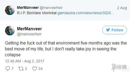 Manveer Heir曾经是《质量效应3》和《质量效应:仙女座》的游戏设计师,他对这次合并有着自己的看法。他推特上发消息称“五个月前离开这个见鬼的地方真是我一生中做的最正确的决定,但看着它分崩离析我心中一点都不开心。”随后他又发消息称愿蒙特利尔工作室安息。