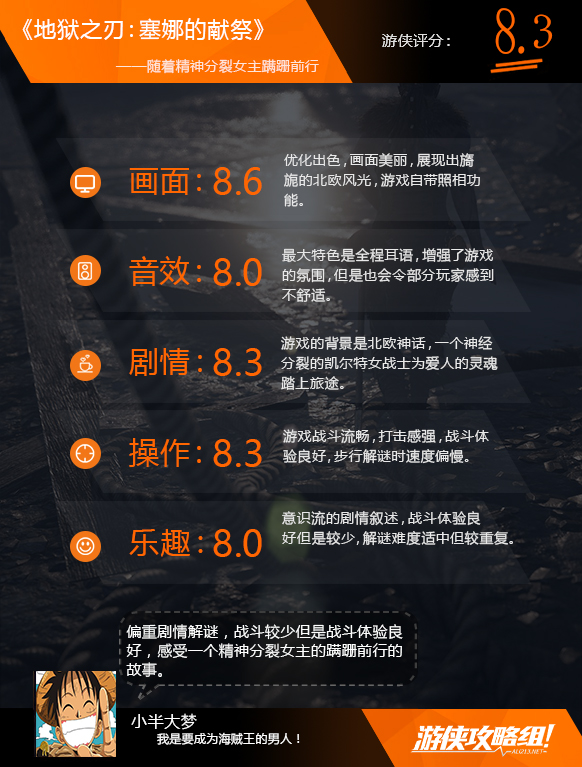 如果你是爱玩剧情解谜游戏,并对北欧神话有兴趣的玩家,那你一定会喜欢这款游戏。如果你只是为了重新体验《鬼泣》一般的爽快战斗,那你可能会对它有些失望。全程耳语也可能会令部分玩家觉得非常刺激,部分玩家则被吵到头昏脑胀。而游戏中旖旎的北欧风光配上自带的照相模式,使游戏也增加了一些趣味性。