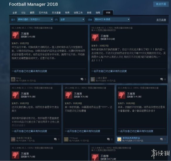 经过去年的事情后,国内FM玩家对于今年的FM2018中文版还是抱有期待,毕竟去年的汉化可以说是被逼无奈下的赶工作品,那么今年有超过半年的准备时间,且大量内容可以直接沿用前一版的汉化,这种情况下玩家对新的中文翻译也充满了期待。但是等到Beta版后,可能中国玩家又要失望了。Beta版仅仅放出一天,又被差评刷屏了。