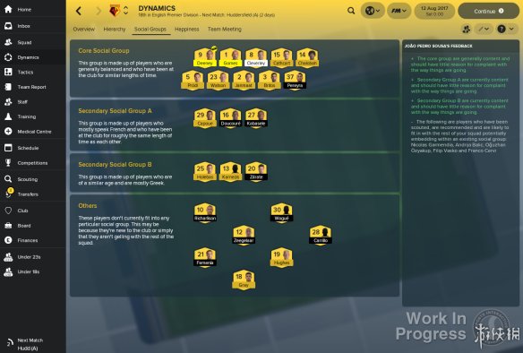 首先要说的是FM在前期大力宣传的动态机制。众所周知,在一只足球队中,队内的氛围如何是很重要的。有人的地方就有江湖,在足球世界中这句话一样通用。古有拜仁被称为绿茵好莱坞,对内派系林立影响战斗力;今有大巴黎内马尔卡瓦尼队内争夺点球权,世界各地球迷都抱着吃瓜群众的心态观赏事态发展。而这些如今终于能够体现在FM的世界里了。动态是关于球队内部,球员之间的层级、关系,以及球员对主教练的支持程度等。增加了这个系统后,如何控制好更衣室成了游戏中的一个新难题。不光是依靠获胜,与球员之间的关系更加重要了。可能会不能单纯凭状态选择首发球员了,不同首发球员的选择会影响你与队内大佬的关系,从而影响你对球队更衣室的控制。买卖球员是如此,作为一个新教练,要获得更衣室大佬的支持,可能会选择签下一些与大佬关系好的球员。像穆里尼奥一样,从老东家带走几个死心塌地的球员增加在新俱乐部的掌控,也成为了一种重要的选择。