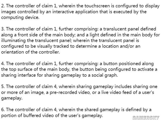 这份文件明确提到了手柄的触摸屏可以显示计算设备上运行的应用程序的图像,手柄前方有一块半透明面板,是用来做视觉跟踪以确定手柄的位置和方向的。手柄的正面还有一个用于分享游戏截图或视频的按钮。除了可显示画面的触摸屏之外,其他的功能我们基本都可以在目前的PS4手柄上见到。