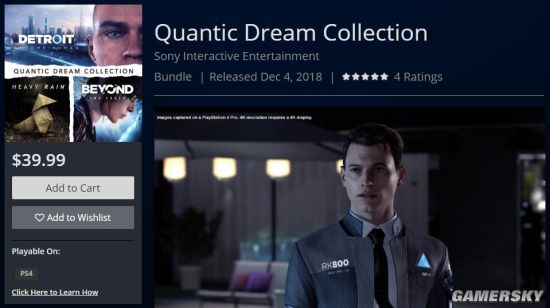 Quantic Dream今日推出旗下三部作品《底特律:变人》《暴雨》《超凡双生》的PS4合集版,售价39.99美元(约合人民币274元),仅在美服和加拿大服的PS商店发售。