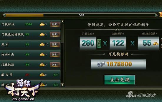 除此之外,在全新的打金条玩法中,玩家完成20项日常活动均可获得数量不菲的金条奖励,这些金条都是可以兑换得到大量银两的,一定不可错过!