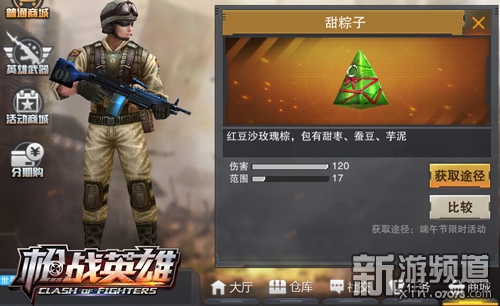为了迎接端午节,枪战商城里限时出售【甜粽子】和【咸粽子】两款手雷,虽然Q萌的粽子造型看起来很美味,但是千万不要小看它们的杀伤力!远超高爆手雷的伤害值和极大的杀伤范围,让粽子手雷成为战场上威力最强的投掷武器,团战时丢一个粽子出去,直接把对面一波带走!
