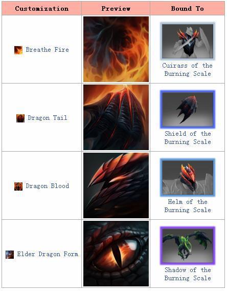 烈焰之鳞:大招改变4技能,头部改变3技能,盾牌改变2技能,胸甲改变1技能