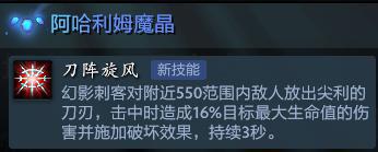 刀阵旋风的加入让幻影刺客拥有了如今为数不多的破坏效果,同时百分之16的最大生命值的伤害让幻影刺客无论是面对残血英雄补伤害还是对敌方前排都更加强力,三秒的破坏效果足以让钢背兽等拥有减免伤害类被动技能的英雄死于幻影刺客手下。
