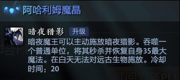 在夜魔魔晶刚刚出现时,笔者一直觉得这是一个非常鸡肋的存在,但是在本次更新中提升了恢复量并且可以在白天使用,在英雄介绍中只写了可以恢复百分之35的最大魔法,但是笔者实际测试后发现百分之35的生命恢复也还是存在的,并且暗夜猎影可以吞噬支配以及大支配的单位,超强的恢复能力以及短冷却,堪比一个带回复的点金手,只要核心装BKB做出来后就可以将魔晶提上日程了,毕竟百分之35的生命魔法恢复是真的很强。
