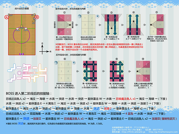 躯体重击后,尾部出现,ST记得拉好,DPS别打错部位,全员站位可参考图。尾部会用"尾巴鞭打"攻击ST,不是很疼,但物理输出职业不要跟 ST站的过近。尾部出现后,会对的ST使用永久性DEBUFF"水镜飞散",Healer尽量提前给ST加好持续恢复技能,也可事先和另一Healer商 量好轮流治疗。