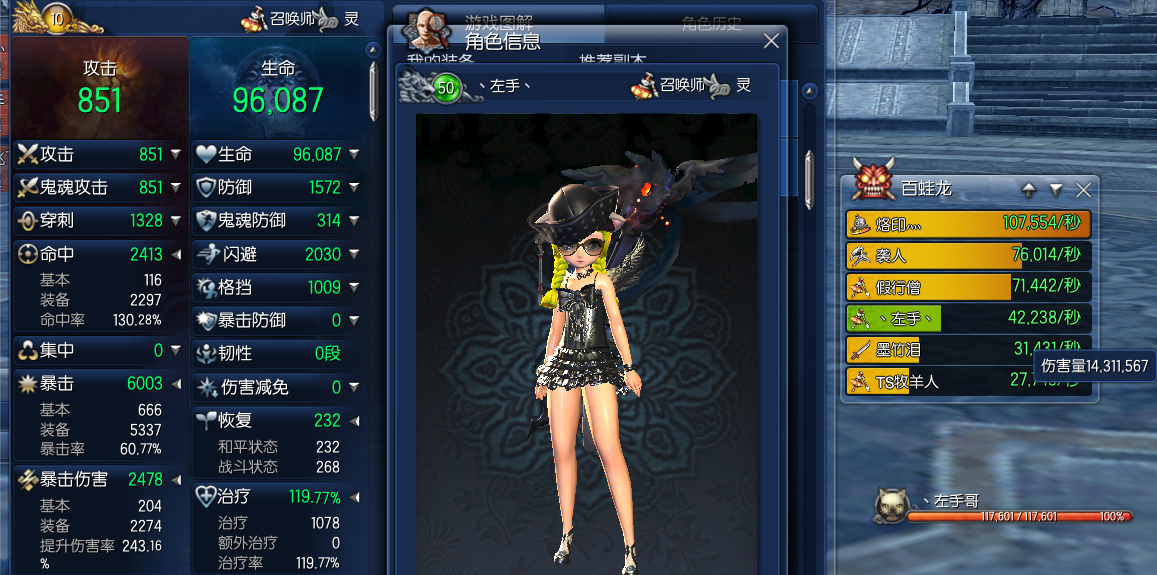 那个伤害量是我练霓裳剑士的,小号的,并不是他们的,看到这2个召唤的秒伤,我真不知道说什么好,这真是高的非常恐怖啊,难不成是 紫气攻毒BUFF的问题?
