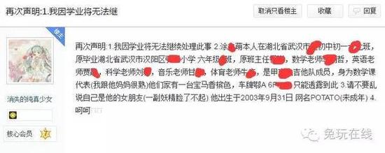网友们扒到了@飞翔丿电竟 刚刚毕业的小学为 武汉X桥小学 ,于是很多吧友准备去这个根本没什么人的小学贴吧爆一爆吧泄愤,而在这里则出现了这个故事的女主@消失的纯真少女,说自己是涂某萌的小学同学兼QQ好友,说这个事情有蹊跷。