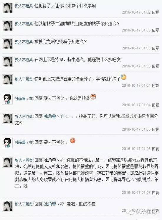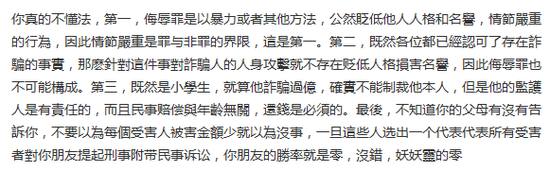 虽然没有反驳涂谋萌的行骗行为,但是称可能不是同一个人,并且他还是未成年不承担任何法律责任所以吧友们没有权利找他的麻烦,甚至@消失的纯真少女 表示自己的父母分别是法官和律师,查阅了各种资料之后表示网友们甚至要因为网上发表对涂谋萌的侮辱性言论而背负上刑事责任!网友们还只有6%的可能性胜诉,好精准的数字啊,不愧是法师家庭出身