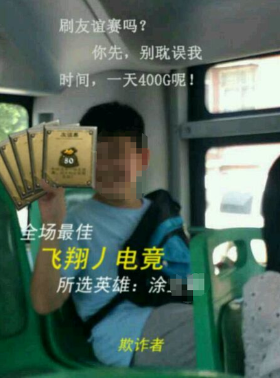 而最近,有个骗子火了:TLM#**** 友谊赛你先。贴吧ID:飞翔丿电竟,据网友爆料能查到的已经骗了20000金币不止了,恩,没多打0,确实是2W,发家致富在此一举了简直。