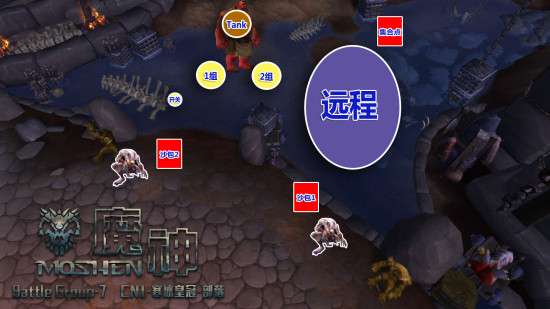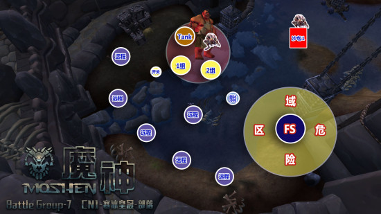 近战2组我在后面额外安排一个替补沙包是为了在小狂暴后他也进去分担,否则4人太伤。也就是说小狂暴前,此人一直木桩,小狂暴后,此人和右边2组一起吃顺劈----1组吃的时候别上去,左右会变成各5个人。