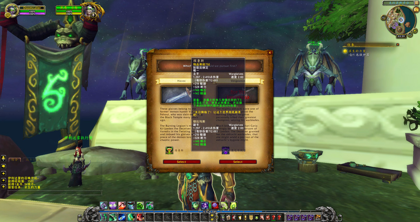 我来到克拉苏斯平台,凯恩迎上来向我报告。就他的说法,过去我们长期依赖伊利丹大人的力量去消灭军团中最强大的战士,如今我们失去了他,很多人担心我们该怎样做。但凯恩也带来了好消息。我们发现了两副武器的线索,据说可能比伊利丹大人的埃辛诺斯战刃还要强大。凯恩表示若行动迅速,我们有时间能获得其中一副,从而大大增加我们对抗军团的能力。至于哪一副武器值得我们下手,凯恩把决定权留给了我。