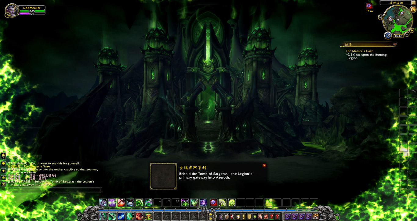 我向坩埚里看去,恶魔的血液在其中翻滚沸腾,散发着邪能的恶魔灵魂漂浮在血液表面。我开始看到一些模糊的影像,跟着变得越来越清晰,直到一座巨大的建筑出现在我眼前。我看到的是萨格拉斯之墓,黑暗泰坦肉身的所在地,也是燃烧军团在艾泽拉斯的主要传送门。