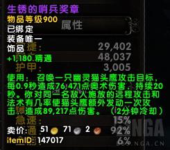 然后说说萨墓的饰品测试,首先,兽王猎能用的饰品不多,效果也一般。目前国外大佬觉得还行的2个饰品,一个是猫头鹰饰品“生锈的哨兵徽章”还有一个是“灭绝引擎”