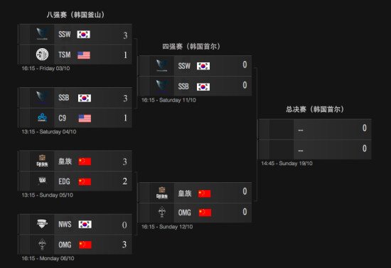 10月11日至10月12日,2014赛季LOL全球总决赛半决赛即将在韩国首尔拉开战幕。11日16时,韩国兄弟战队SSB与SSW上演韩国大乱斗,对 阵双方究竟是SSB再次制裁SSW最终挺近决赛,还是SSW打破魔咒成功击败SSB,让我们拭目以待。另一场半决赛于12日16时正式开战,由来自中国 LPL赛区两支强队皇族与OMG再次上演中国德比。在上届全球总决赛八强赛中,SH皇族成功击败OMG晋级决赛。如今双方再次相遇,谁能进入最后的决赛, 敬请期待。