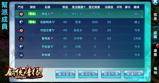 一个帮派中能呼风唤雨的莫非‘堂主’一职了,堂主权力最大,可以自由设置一些有趣的称谓,也容易辨识每一个帮派组的织架构;有了‘堂主’不外乎当然也有‘副堂主’一职,‘副堂主’是由堂主任命行事,责任重大如有紧急事件发生可代替堂主行使帮派许可权,当玩家的帮派势力越大该职位人数也会随着帮派等级的提升而有所增加。